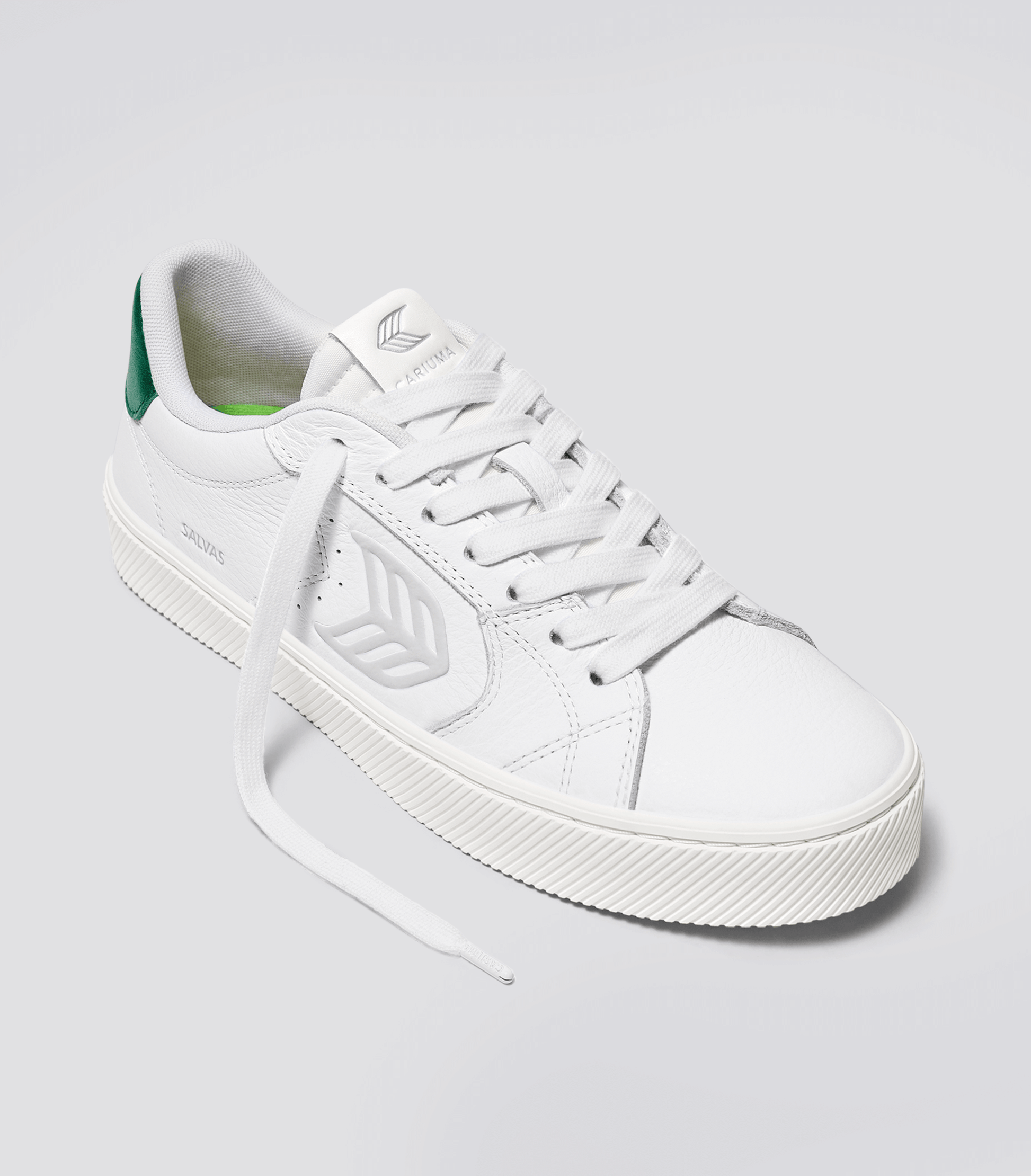 Shop the SALVAS White Premium Leather Ice Logo Metallic Green Sneaker